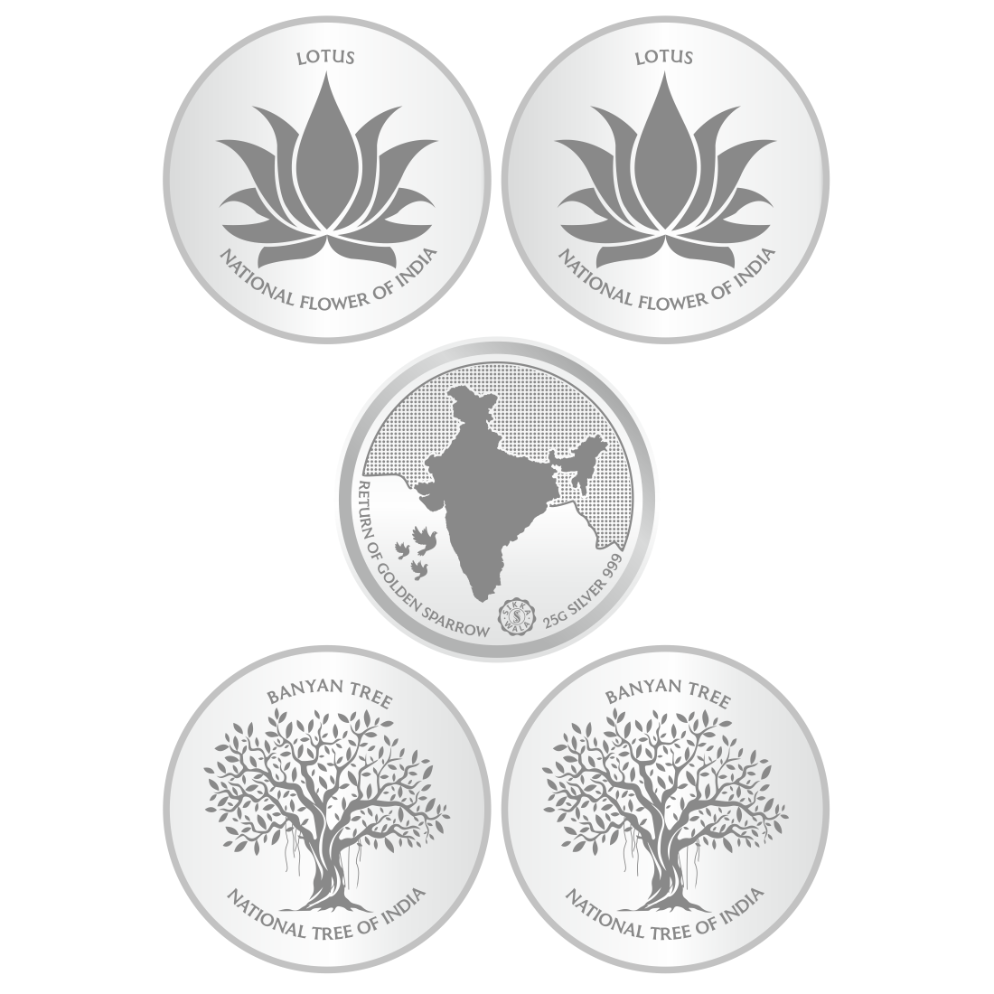 Sikkawala BIS Hallmarked 999 Silver National Symbol Set Of 5 In 125 Gm Coin-Sk5Scf25